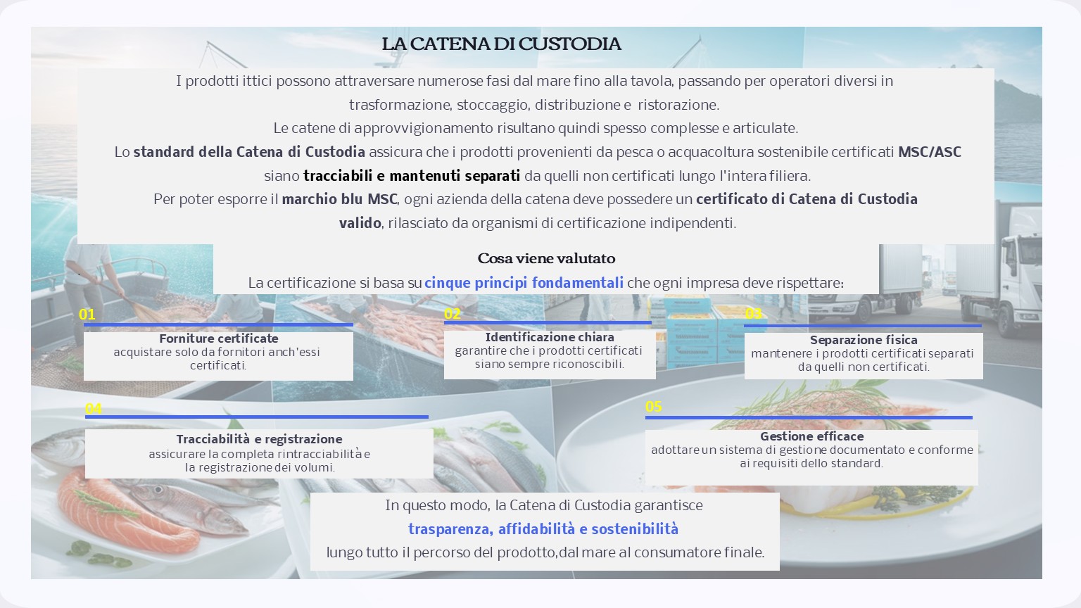 Gli standards della sostenibilità ittica MSC/ASC soddisfano le linee guida internazionali sulle migliori pratiche per la certificazione di prodotti ittici e l'ecolabelling.